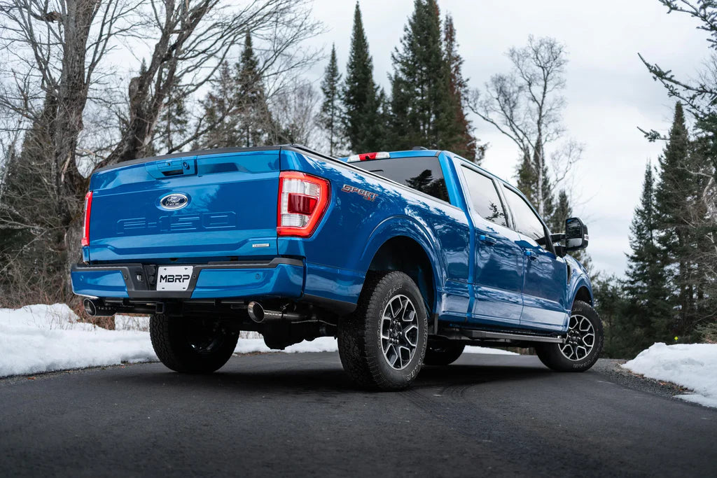 Upgrade your 2021-2026 Ford F-150 with the MBRP® 3-Inch, Armor Lite, Street Profile, Dual Rear Exit, Cat-Back Exhaust with Stainless Steel Tips. 3-Year Warranty included.